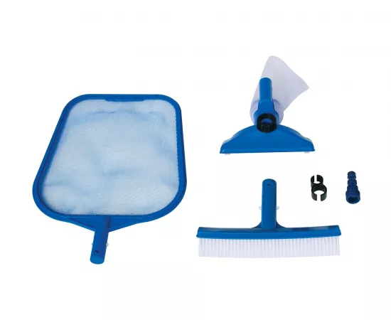 Acest kit de curatare si intretinere a piscinei, functioneaza prin cuplarea la furtunul de gradina. Curatarea se face pe principiul "Venturi". Se poate adapta un maner telescopic(Cod Intex : 29054) cu diametrul de 26,2 mm (nu este inclus in pret). Setul este compus dintr-o plasa pentru curatat mizeria de la suprafetei piscinei si o perie care curata mizeria de pe fundul piscinei si un cap de curatare a fundului piscinei .Este recomandat la curatarea piscinelor cu diametrul de pana la 488 cm.
