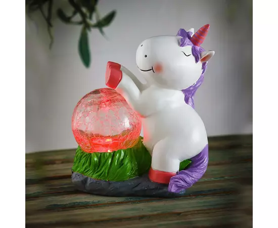 Decoratiunea solara unicorn este prevazuta cu un acumulator tip 1.2V Ni-mh 300mAh AAA si un panou solar amorf. Aceasta include 1 sursa de tip LED multicolor, ce isi schimba culoarea.