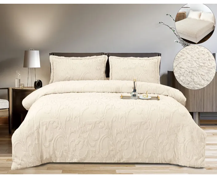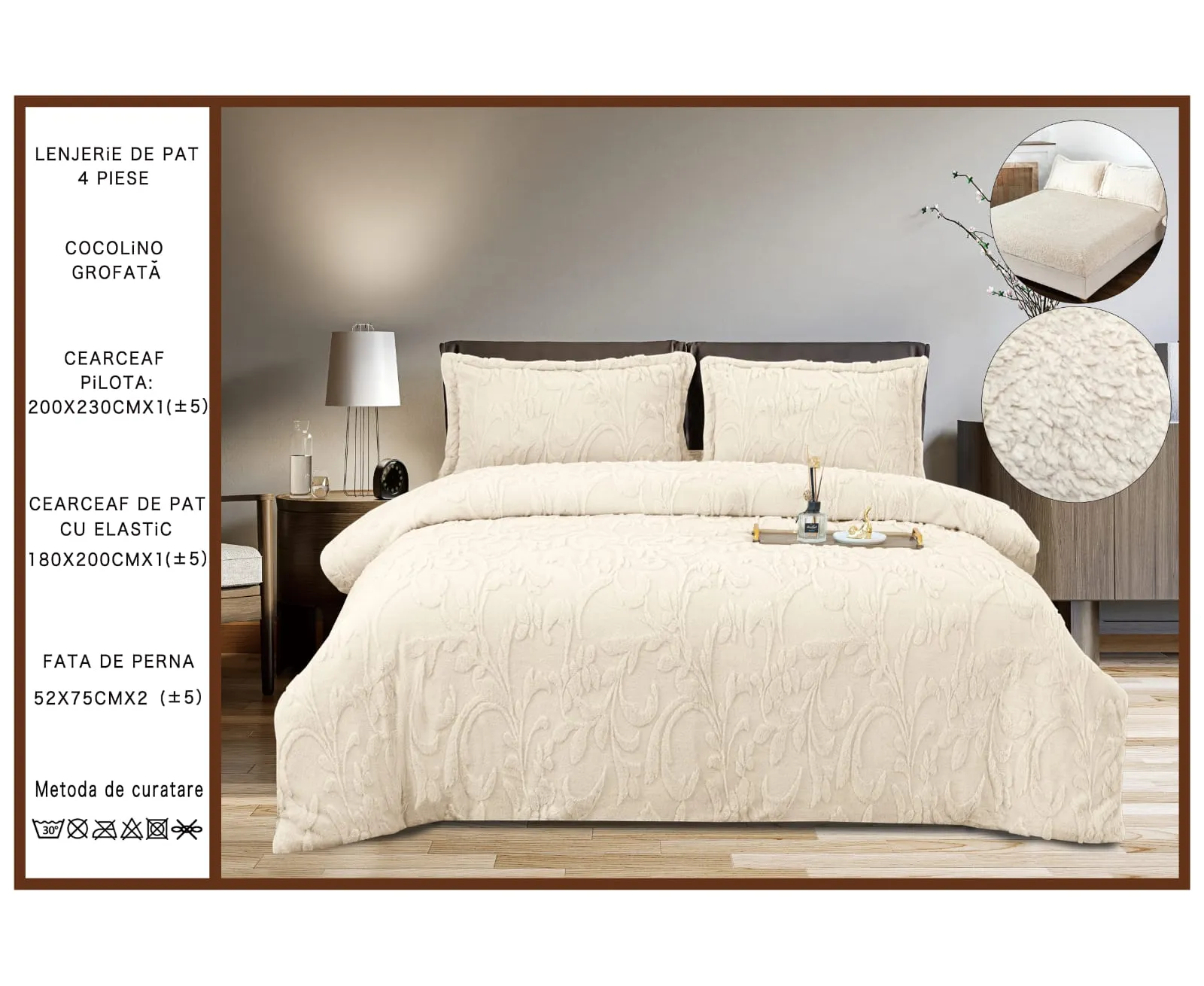 Lenjerie Cocolino 4 Piese, Blana Imitatie iepure, Pentru Pat Dublu, cu Elastic, Crem - PIT403