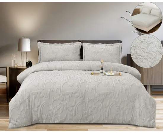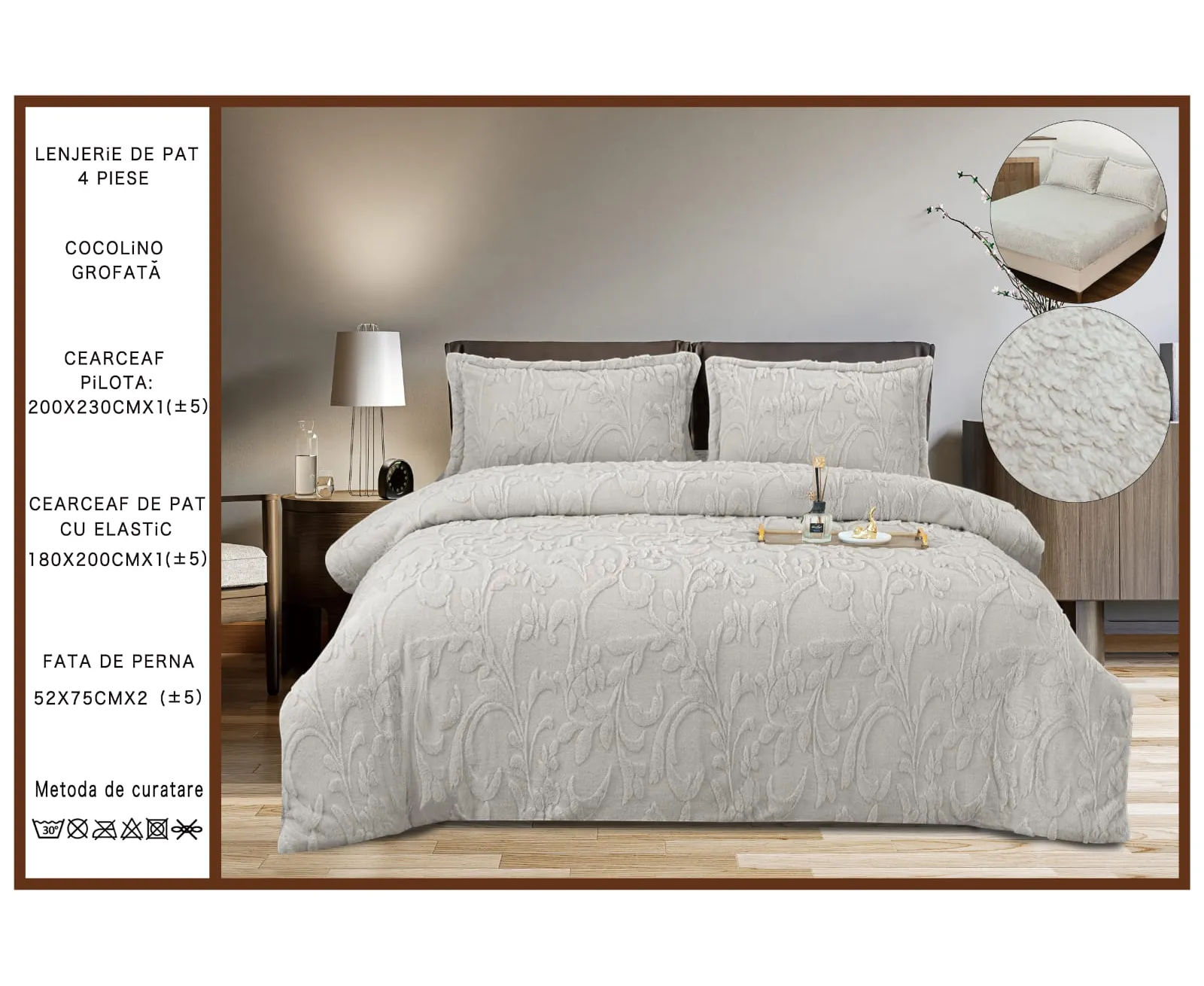 Lenjerie Cocolino 4 Piese, Blana Imitatie iepure, Pentru Pat Dublu, cu Elastic, Gri - PIT404