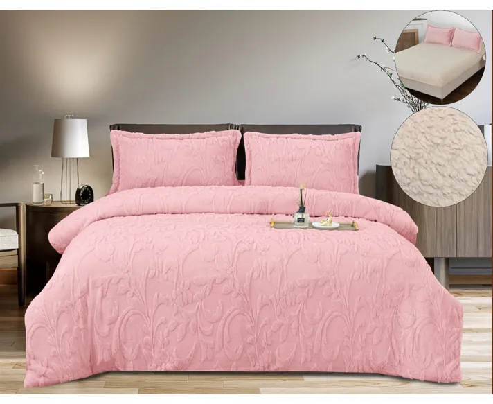 Lenjerie Cocolino 4 Piese, Blana Imitatie iepure, Pentru Pat Dublu, cu Elastic, Roz- PIT400