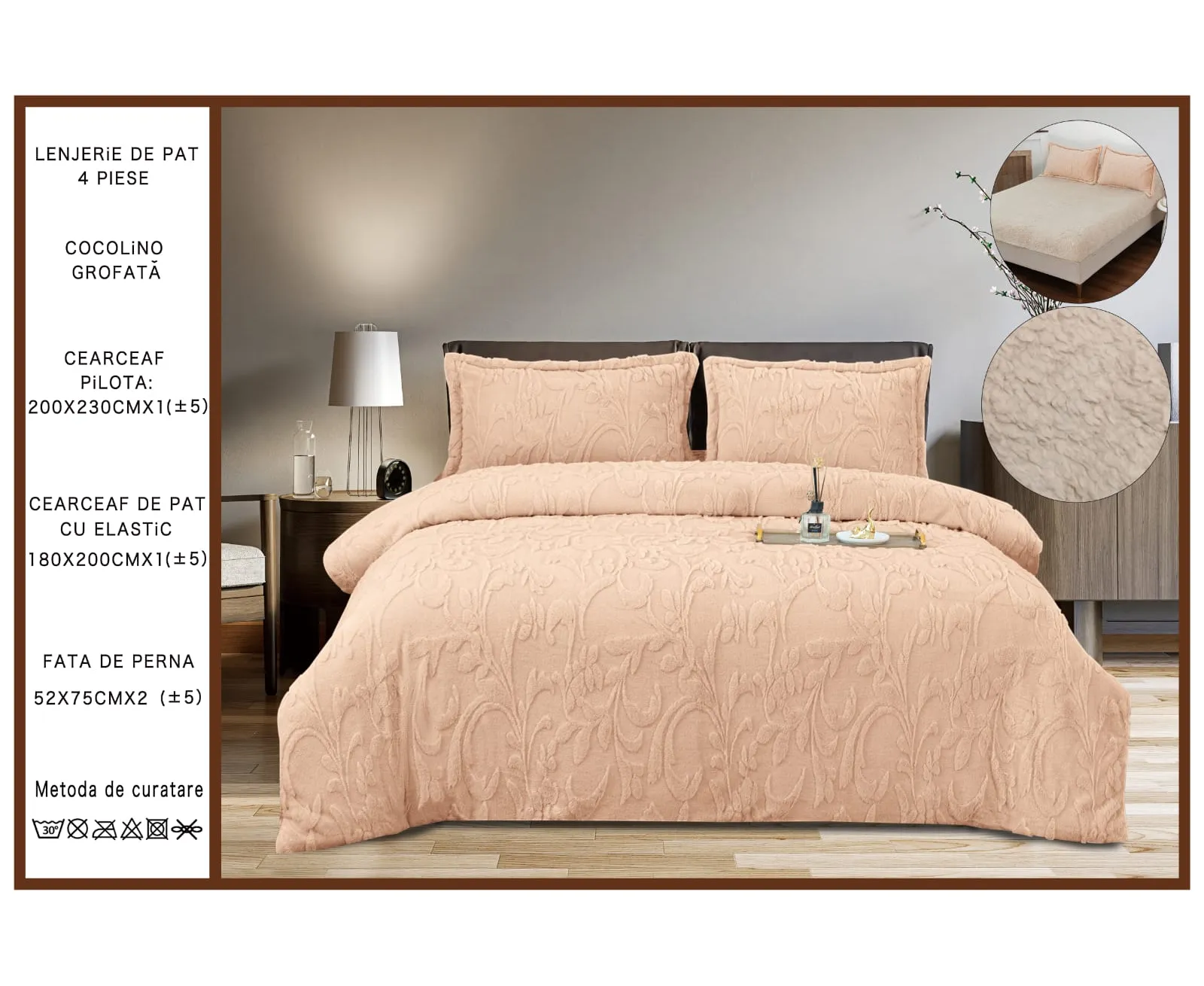 Lenjeria de pat cu 4 piese, Cocolino, cu blana de iepure artificiala, adauga o nota de lux si confort in dormitorul dumneavoastra. Aceasta lenjerie de pat premium este conceputa pentru a oferi o experienta de somn deosebit de placuta si pentru a aduce o atingere de eleganta in incaperea dumneavoastra.