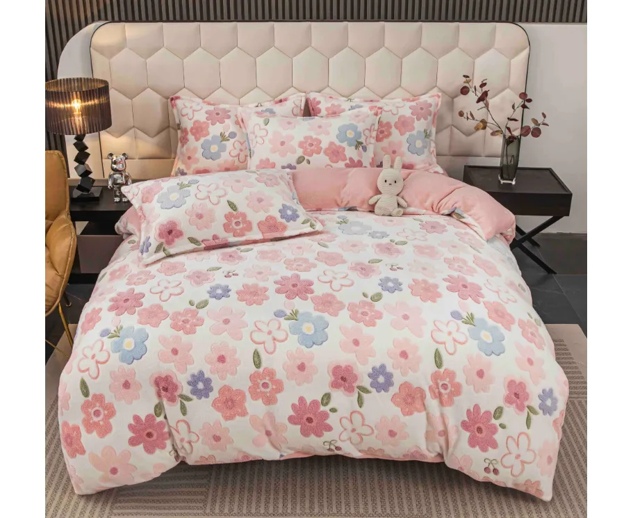 Lenjerie Cocolino 4 Piese Pentru Pat Dublu cu Elastic- JOJ818 Flori Roz