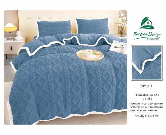 Pachetul contine: - cearceaf pilota 200x230 cm ± 10cm - cearceaf de pat 200x230 cm ± 10cm - fata de perna (2buc.) 50x70 cm - fata de perna (2buc.) 70x70 cm