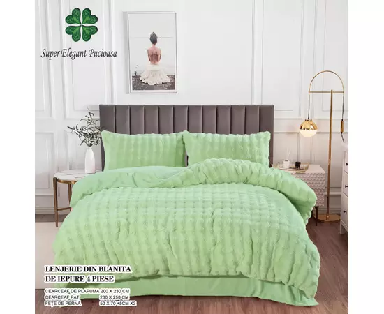 Lenjerie Cocolino Cu Blanita de Iepure Pentru Pat Dublu, 4 piese , VERDE DESCHIS - PUC98