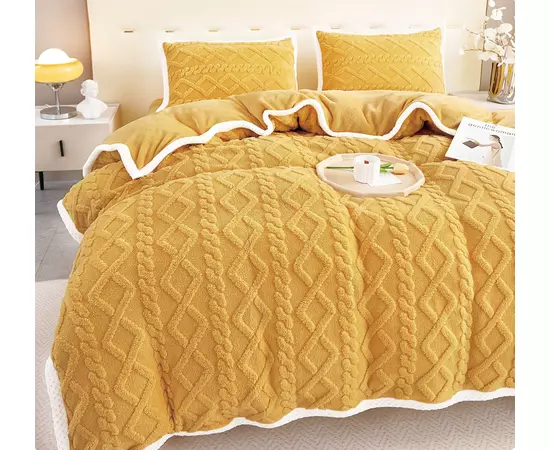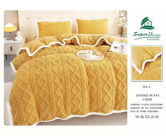 Setul de lenjerie este confectionat din microfibra plusata, cu o textura pufoasa, foarte calduroasa si placuta la atingere si care nu intra la apa. Se poate spala la 30 de grade Celsius si nu necesita calcare dupa spalare.