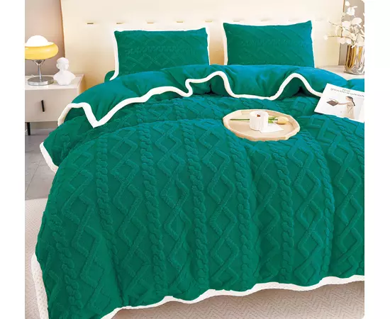 Setul de lenjerie este confectionat din microfibra plusata, cu o textura pufoasa, foarte calduroasa si placuta la atingere si care nu intra la apa. Se poate spala la 30 de grade Celsius si nu necesita calcare dupa spalare.