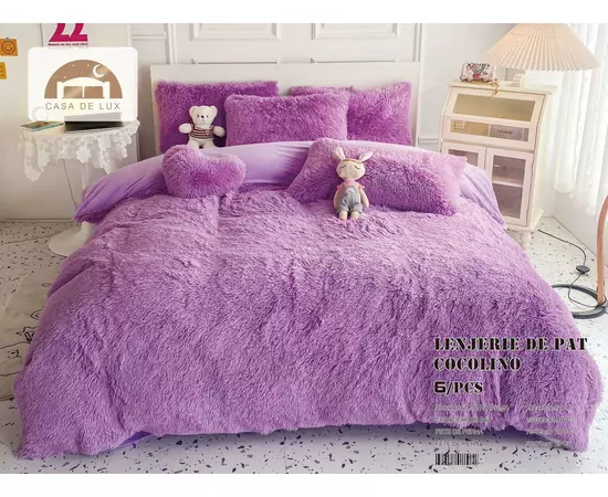 Produsul prezinta doua texturi de material cocolino, astfel incat, cearceaful de pat, partea inferioara a cearceafului de pilota si partea inferioara a fetelor de perna sunt din microfibra plusata fina; cearceaful de pilota pe fata principala si fetele de perna sunt din cocolino fluffy super pufos.