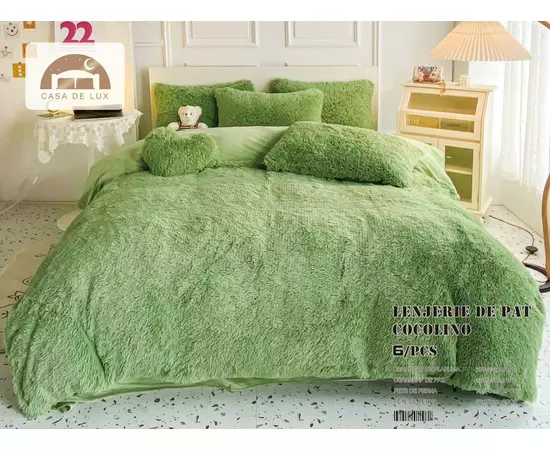 Produsul prezinta doua texturi de material cocolino, astfel incat, cearceaful de pat, partea inferioara a cearceafului de pilota si partea inferioara a fetelor de perna sunt din microfibra plusata fina; cearceaful de pilota pe fata principala si fetele de perna sunt din cocolino fluffy super pufos.