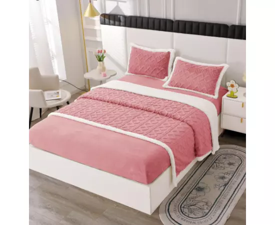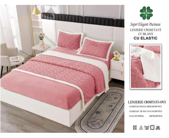 Lenjerie cu Blanita, 4 Piese, cu Elastic Pentru Pat Dublu, Roz - PUC105