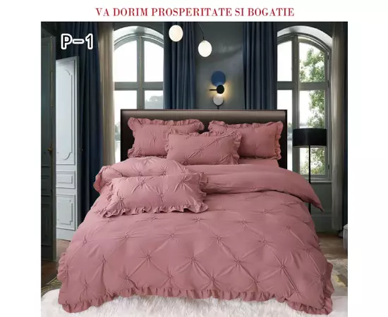 Lenjeria de Lux cu Pliuri și Volan, formată din 6 piese pentru pat dublu, reprezintă o expresie rafinată a eleganței și confortului în designul interior. Această lenjerie fină și sofisticată adaugă un aer de opulență și rafinament în orice dormitor.