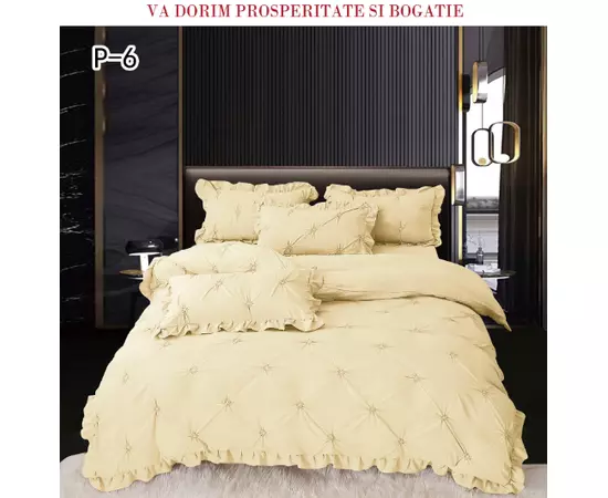 Lenjeria de Lux cu Pliuri și Volan, formată din 6 piese pentru pat dublu, reprezintă o expresie rafinată a eleganței și confortului în designul interior. Această lenjerie fină și sofisticată adaugă un aer de opulență și rafinament în orice dormitor.