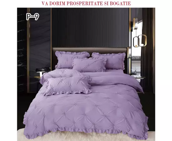 Lenjeria de Lux cu Pliuri și Volan, formată din 6 piese pentru pat dublu, reprezintă o expresie rafinată a eleganței și confortului în designul interior. Această lenjerie fină și sofisticată adaugă un aer de opulență și rafinament în orice dormitor.