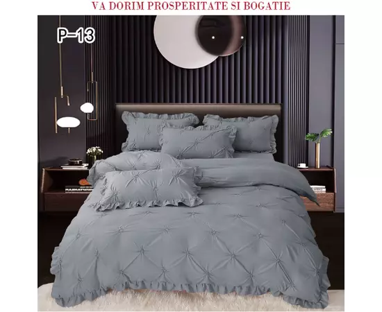 Lenjeria de Lux cu Pliuri și Volan, formată din 6 piese pentru pat dublu, reprezintă o expresie rafinată a eleganței și confortului în designul interior. Această lenjerie fină și sofisticată adaugă un aer de opulență și rafinament în orice dormitor.