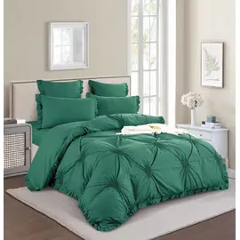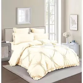 - Design cu volane elegante: Volanele adaugă un element de eleganță și rafinament, conferind un aspect romantic și sofisticat întregii lenjerii. Aceste volane pot fi amplasate pe marginile cearșafului de pat și ale pernelor, creând un efect plin de farmec.