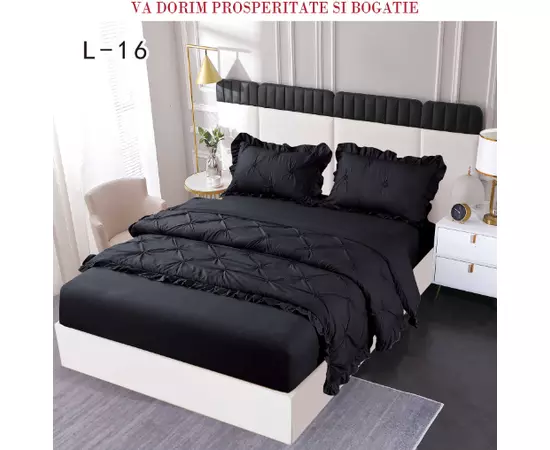 - Design cu volane elegante: Volanele adaugă un element de eleganță și rafinament, conferind un aspect romantic și sofisticat întregii lenjerii. Aceste volane pot fi amplasate pe marginile cearșafului de pat și ale pernelor, creând un efect plin de farmec.