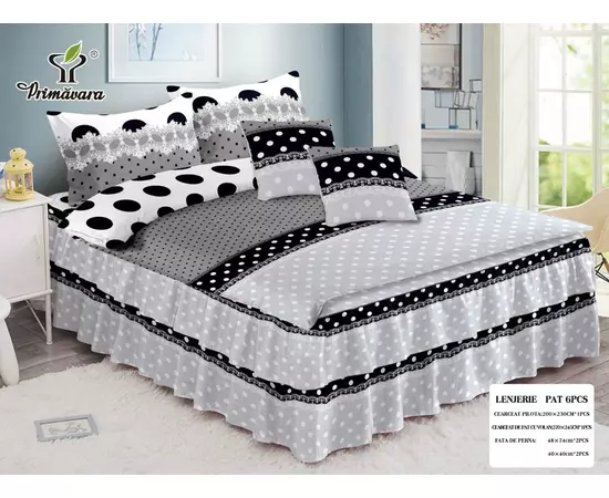 Cearceaful de pat are prins pe fiecare colt cate un elastic care vine prins sub saltea, pentru a nu permite alunecarea cearceafului de pe pat. Pe partea de jos a ceracefului de pat, aveti asezate superbele volanase, care ofera acestor modele eleganta si rafinament. Fetele de perna se inchid cu flep (petrecute). Mod ambalare: punga cu manere, fiind ideala pentru cadou.
