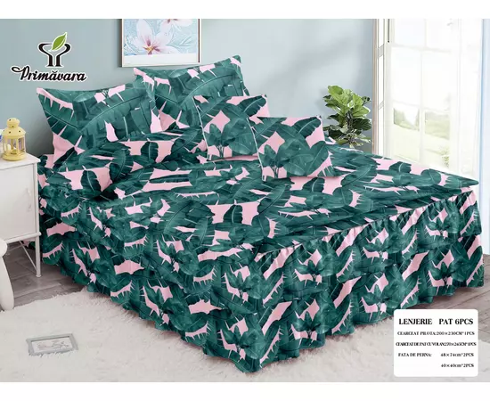 Cearceaful de pat are prins pe fiecare colt cate un elastic care vine prins sub saltea, pentru a nu permite alunecarea cearceafului de pe pat. Pe partea de jos a ceracefului de pat, aveti asezate superbele volanase, care ofera acestor modele eleganta si rafinament. Fetele de perna se inchid cu flep (petrecute). Mod ambalare: punga cu manere, fiind ideala pentru cadou.