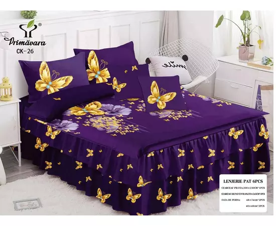 Cearceaful de pat are prins pe fiecare colt cate un elastic care vine prins sub saltea, pentru a nu permite alunecarea cearceafului de pe pat. Pe partea de jos a ceracefului de pat, aveti asezate superbele volanase, care ofera acestor modele eleganta si rafinament. Fetele de perna se inchid cu flep (petrecute). Mod ambalare: punga cu manere, fiind ideala pentru cadou.