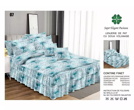 Cearceaful de pat are prins pe fiecare colt cate un elastic care vine prins sub saltea, pentru a nu permite alunecarea cearceafului de pe pat. Pe partea de jos a ceracefului de pat, aveti asezate superbele volanase, care ofera acestor modele eleganta si rafinament. Fetele de perna se inchid cu flep (petrecute). Mod ambalare: punga cu manere, fiind ideala pentru cadou.