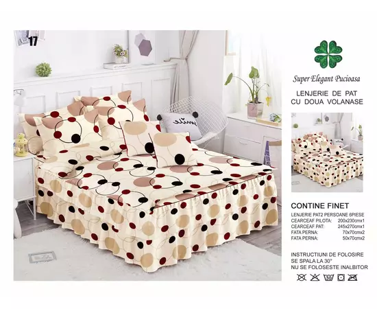 Cearceaful de pat are prins pe fiecare colt cate un elastic care vine prins sub saltea, pentru a nu permite alunecarea cearceafului de pe pat. Pe partea de jos a ceracefului de pat, aveti asezate superbele volanase, care ofera acestor modele eleganta si rafinament. Fetele de perna se inchid cu flep (petrecute). Mod ambalare: punga cu manere, fiind ideala pentru cadou.