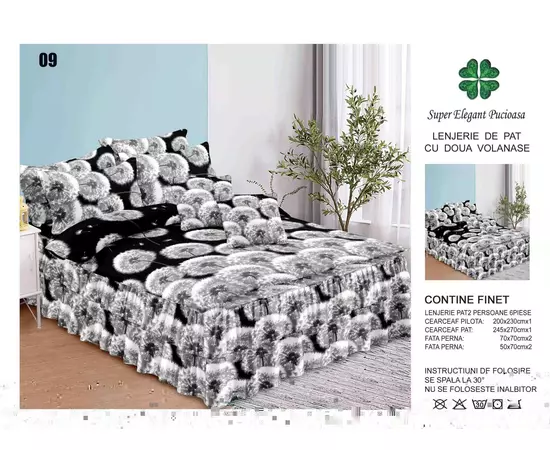 Cearceaful de pat are prins pe fiecare colt cate un elastic care vine prins sub saltea, pentru a nu permite alunecarea cearceafului de pe pat. Pe partea de jos a ceracefului de pat, aveti asezate superbele volanase, care ofera acestor modele eleganta si rafinament. Fetele de perna se inchid cu flep (petrecute). Mod ambalare: punga cu manere, fiind ideala pentru cadou.