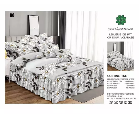 Cearceaful de pat are prins pe fiecare colt cate un elastic care vine prins sub saltea, pentru a nu permite alunecarea cearceafului de pe pat. Pe partea de jos a ceracefului de pat, aveti asezate superbele volanase, care ofera acestor modele eleganta si rafinament. Fetele de perna se inchid cu flep (petrecute). Mod ambalare: punga cu manere, fiind ideala pentru cadou.