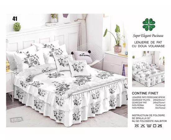 Cearceaful de pat are prins pe fiecare colt cate un elastic care vine prins sub saltea, pentru a nu permite alunecarea cearceafului de pe pat. Pe partea de jos a ceracefului de pat, aveti asezate superbele volanase, care ofera acestor modele eleganta si rafinament. Fetele de perna se inchid cu flep (petrecute). Mod ambalare: punga cu manere, fiind ideala pentru cadou.
