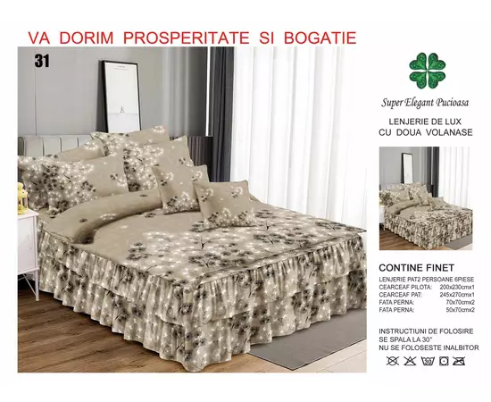 Cearceaful de pat are prins pe fiecare colt cate un elastic care vine prins sub saltea, pentru a nu permite alunecarea cearceafului de pe pat. Pe partea de jos a ceracefului de pat, aveti asezate superbele volanase, care ofera acestor modele eleganta si rafinament. Fetele de perna se inchid cu flep (petrecute). Mod ambalare: punga cu manere, fiind ideala pentru cadou.