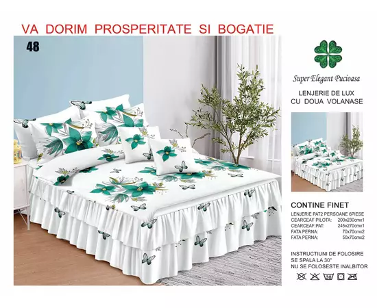 Cearceaful de pat are prins pe fiecare colt cate un elastic care vine prins sub saltea, pentru a nu permite alunecarea cearceafului de pe pat. Pe partea de jos a ceracefului de pat, aveti asezate superbele volanase, care ofera acestor modele eleganta si rafinament. Fetele de perna se inchid cu flep (petrecute). Mod ambalare: punga cu manere, fiind ideala pentru cadou.
