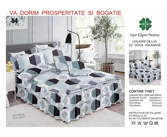 Cearceaful de pat are prins pe fiecare colt cate un elastic care vine prins sub saltea, pentru a nu permite alunecarea cearceafului de pe pat. Pe partea de jos a ceracefului de pat, aveti asezate superbele volanase, care ofera acestor modele eleganta si rafinament. Fetele de perna se inchid cu flep (petrecute). Mod ambalare: punga cu manere, fiind ideala pentru cadou.