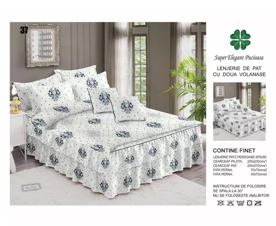 Cearceaful de pat are prins pe fiecare colt cate un elastic care vine prins sub saltea, pentru a nu permite alunecarea cearceafului de pe pat. Pe partea de jos a ceracefului de pat, aveti asezate superbele volanase, care ofera acestor modele eleganta si rafinament. Fetele de perna se inchid cu flep (petrecute). Mod ambalare: punga cu manere, fiind ideala pentru cadou.
