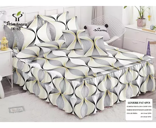 Cearceaful de pat are prins pe fiecare colt cate un elastic care vine prins sub saltea, pentru a nu permite alunecarea cearceafului de pe pat. Pe partea de jos a ceracefului de pat, aveti asezate superbele volanase, care ofera acestor modele eleganta si rafinament. Fetele de perna se inchid cu flep (petrecute). Mod ambalare: punga cu manere, fiind ideala pentru cadou.
