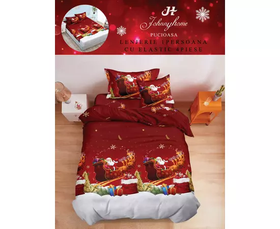 Lenjerie de Pat, Bumbac 100% Finet, 4 piese cu elastic Mos Craciun-