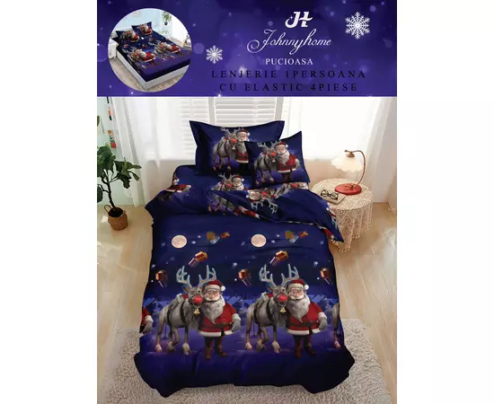 Lenjerie de Pat, Bumbac 100% Finet, 4 piese cu elastic Mos Craciun-