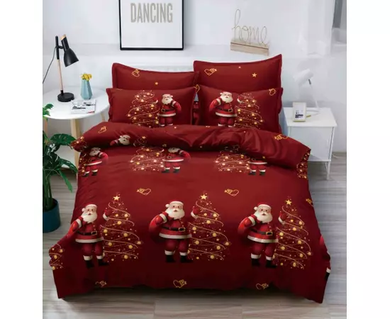 Lenjerie de Pat 1 Persoana, Bumbac Finet, 4 Piese, Rosu cu Mos Craciun si Brad - JO593