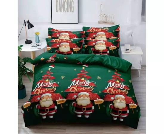 Lenjerie de Pat 1 Persoana, Bumbac Finet, 4 Piese, Verde cu Mos Craciun - JO596