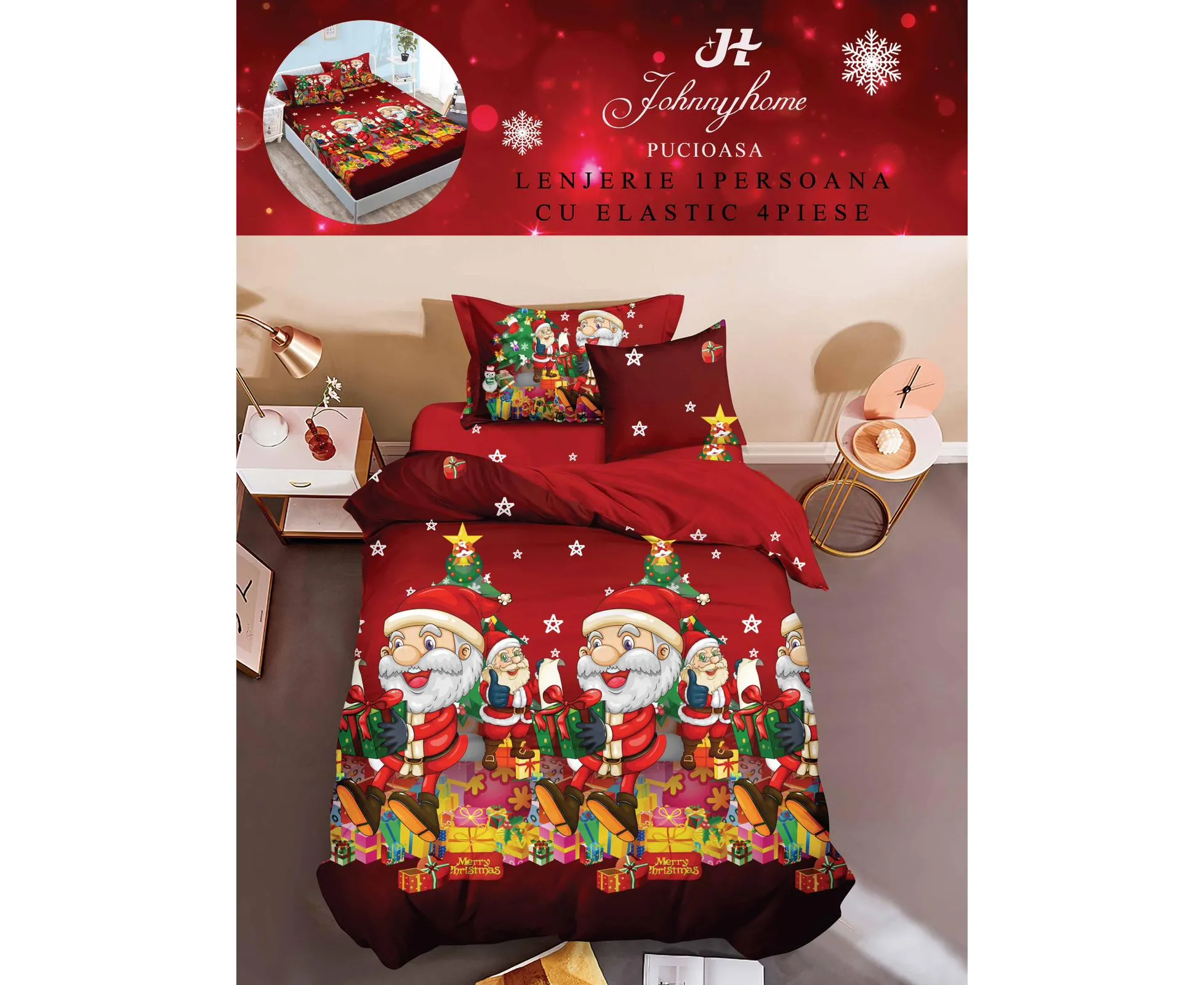 Lenjerie de pat Finet 1 Persoana cu Elastic,Mos Craciun este obtinut din bumbac finet tratat intr-un anumit mod care face ca tesatura sa fie moale, supla si rezistenta in timp ,astfel lenjeria de pat va arata ca noua mult timp.Imprimeul acestei lenjerii de pat este modern aducand o eleganta aparte dormitorului tau.Acesta lenjerie de pat din finet este ideapa pentru a fi oferita cadou celor dragi.
