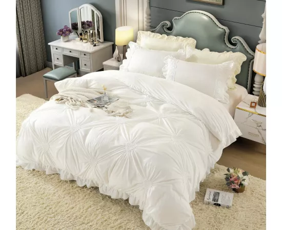 Lenjerie de Pat, din Catifea cu Broderie pentru Pat Dublu, 4 Piese, Alb - JO715