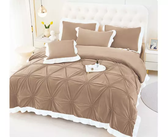 Lenjerie de Pat din Catifea, pentru Pat Dublu, 4 Piese, Maro Deschis cu Margine Alba - FR214