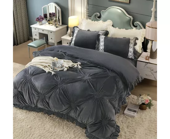 Lenjerie de pat, 4 piese din catifea, cu broderie, pat dublu, Gri Inchis -JO720