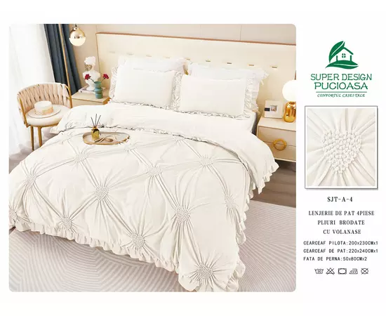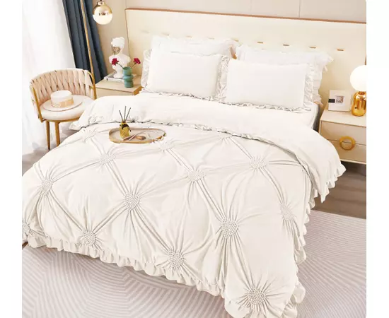 Lenjerie de Pat, 4 Piese din Catifea, cu Volanase, pentru Pat dublu, Cream Deschis - FR156