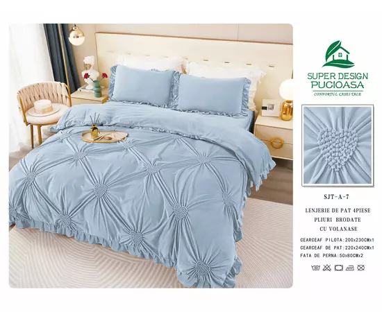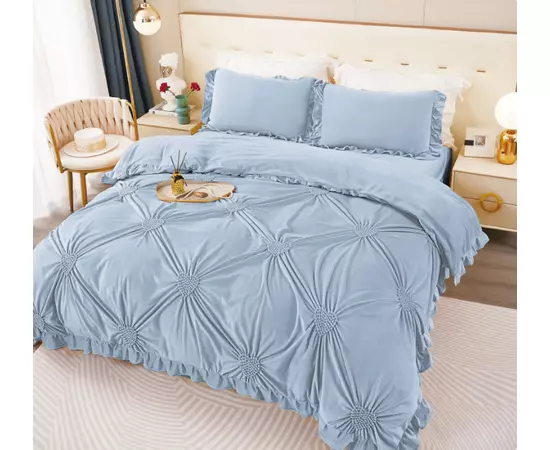 Lenjerie de Pat, 4 Piese din Catifea, cu Volanase, pentru Pat dublu, Gri Albastrui - FR150