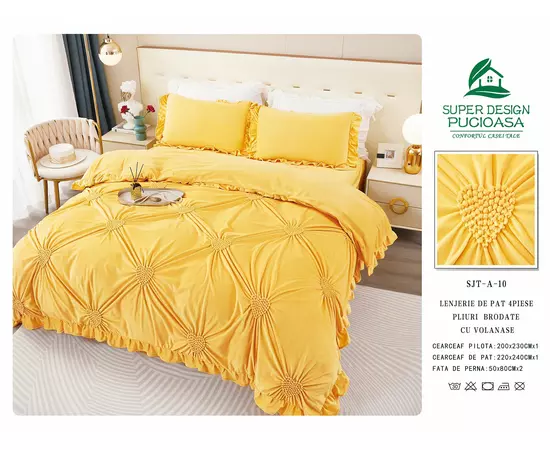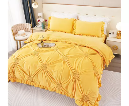 Lenjerie de Pat, 4 Piese din Catifea, cu Volanase, pentru Pat dublu, Galben - FR153