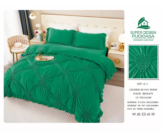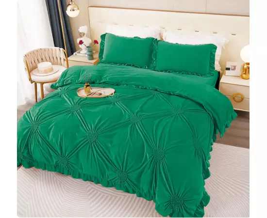Lenjerie de Pat, 4 Piese din Catifea, cu Volanase pentru Pat dublu, Verde - FR154