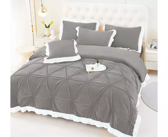 Lenjerie de Pat din Catifea, pentru Pat Dublu, 4 Piese, Gri cu Margine Alba - FR147