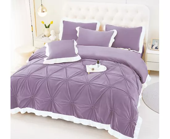 Lenjerie de Pat din Catifea, pentru Pat Dublu, 4 Piese, Lavanda cu Margine Alba - FR141