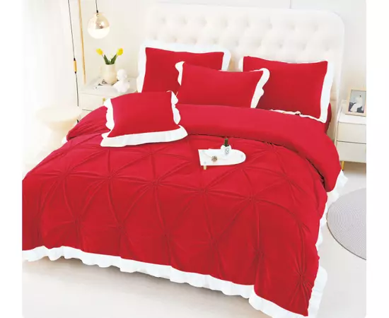 Lenjerie de Pat din Catifea, pentru Pat Dublu, 4 Piese, Rosu cu Margine Alba - FR143