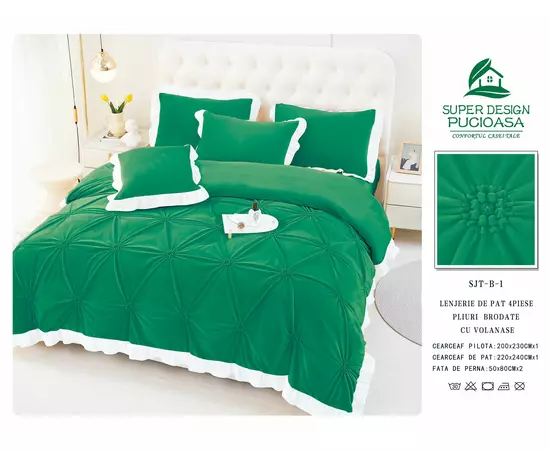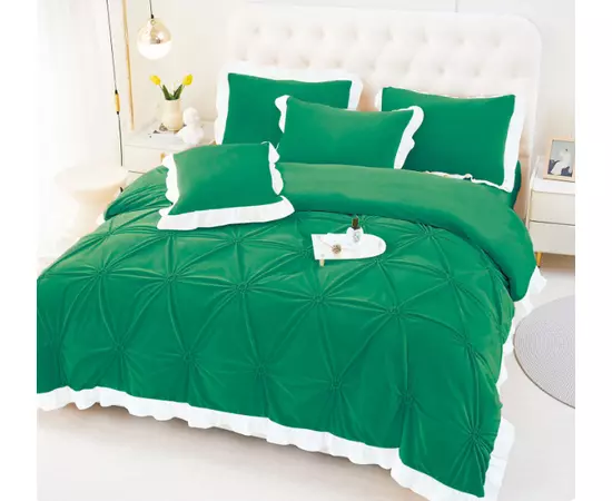 Lenjerie de Pat din Catifea, pentru Pat Dublu, 4 Piese,Verde cu Margine Alba - FR142