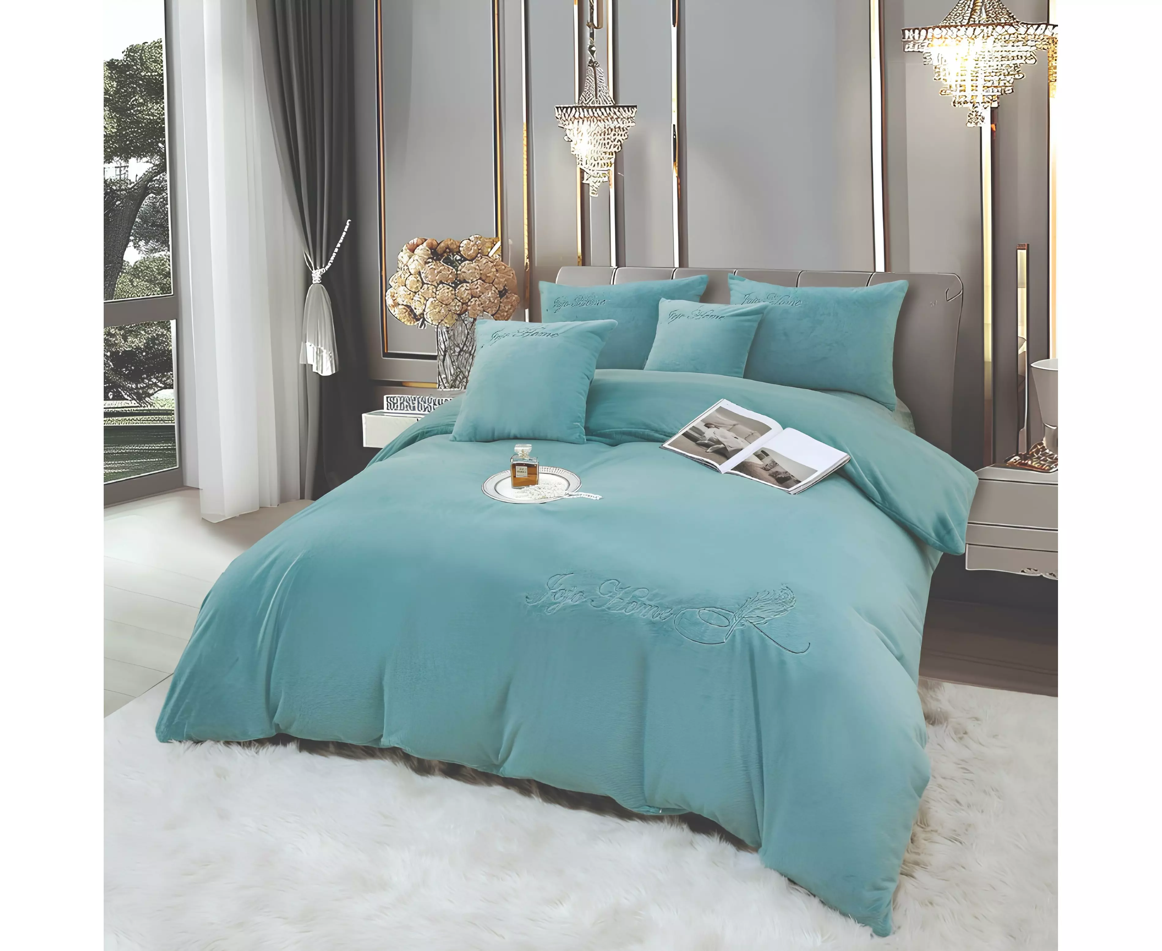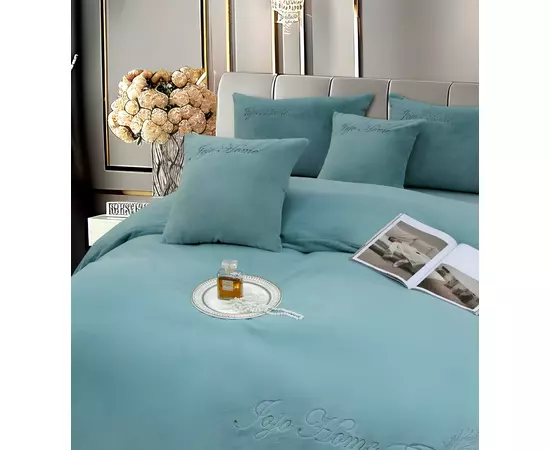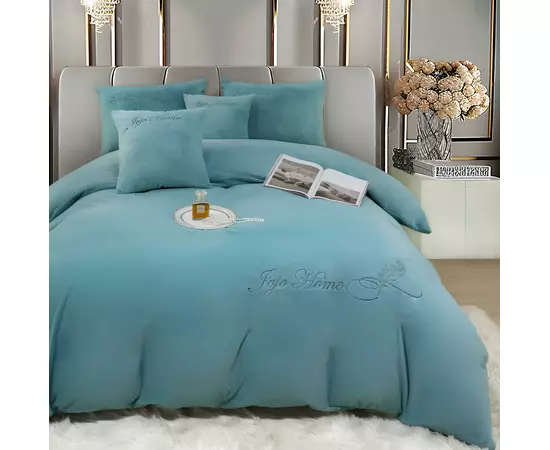 Lenjerie de Pat Brodate , Cearceaf cu Elastic, 6 Piese, Blană de Iepure Artificială cu Fir Scurt, Turcoaz - JOJ639